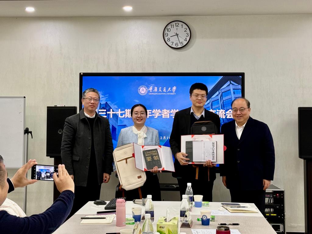 会后,宫辉、张铭向两位青年学者颁发证书,并赠送书籍《要领》及重庆交通大学文创书包,感谢他们为本次交流会带来的精彩报告与前沿分享。