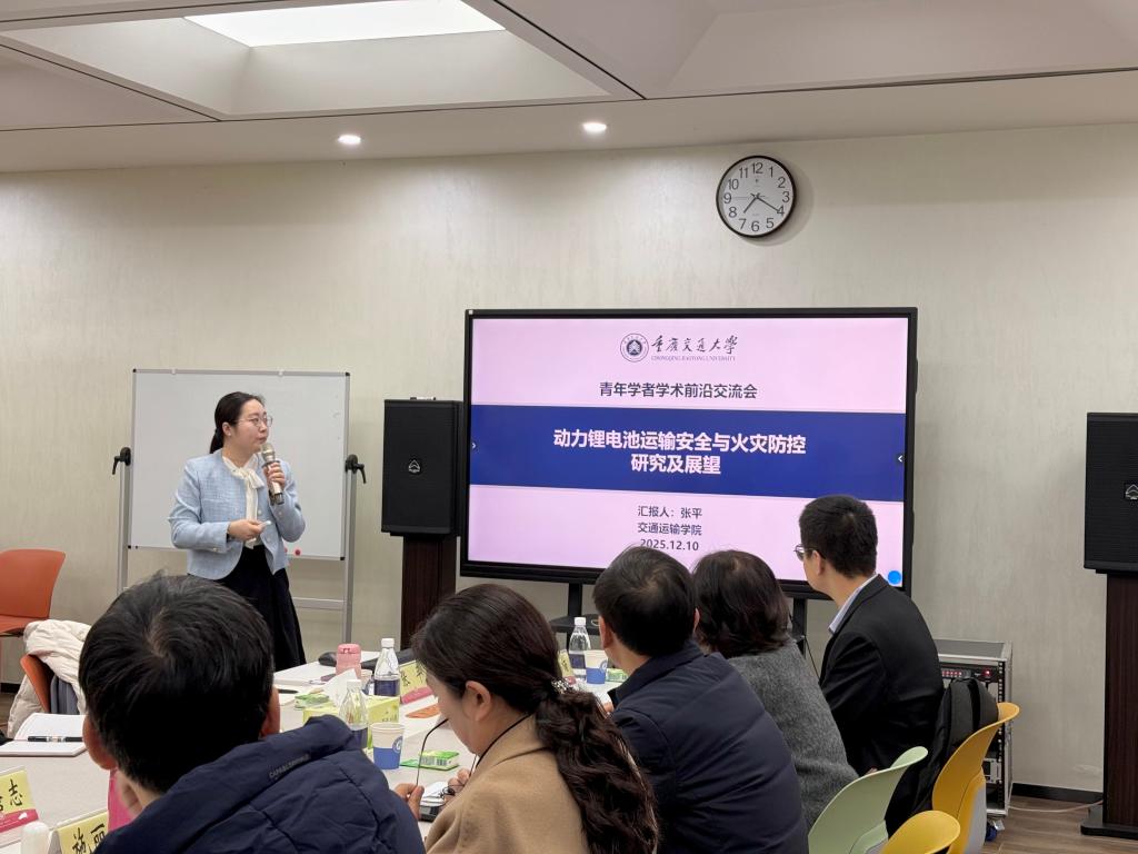 2025年12月10日上午,重庆交通大学第三十七期青年学者学术前沿交流会在南岸校区明德楼七楼2919会议室举行。校党委书记宫辉、副书记张铭,人事处、研究生院、教务处、科技处等相关职能部门负责人出席会议。本期学术交流会特邀交通运输学院讲师张平、经济与管理学院讲师许浩楠作专题报告,围绕“动力锂电池运输安全与铁水联运”展开深入研讨,共同探索交通运输安全与智慧物流发展的前沿路径。