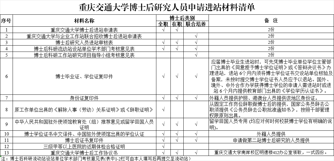 附件:重庆交通大学博士后研究人员申请进站材料清单
