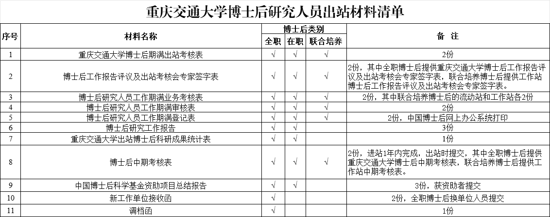 (2)全职博士后提前1个月向所在流动站提出出站申请,并提交《重庆交通大学博士后研究人员科研成果统计表》《重庆交通大学博士后研究人员出站考核表》以及科研成果印证材料、论文检索证明等。